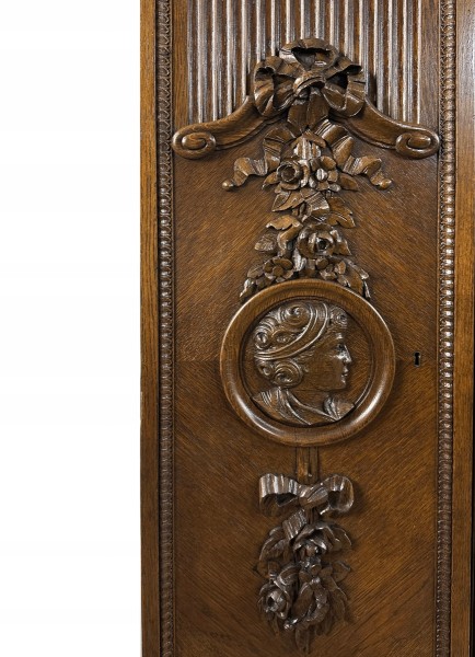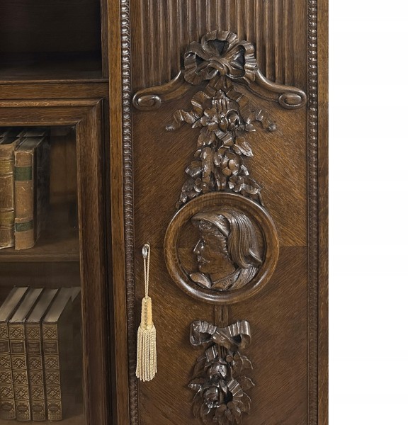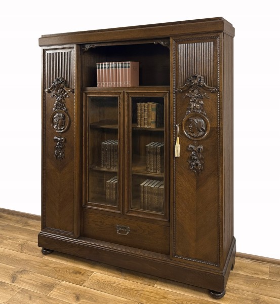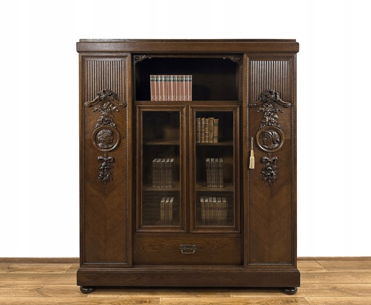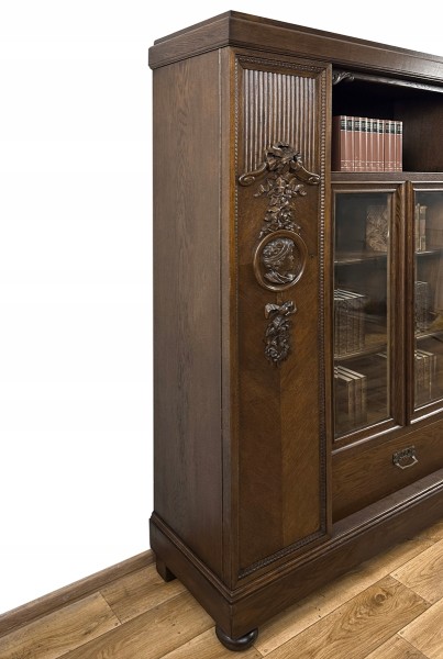 To jedna z piękniejszych bibliotek, jakie w ostatnich miesiącach znalazły się w naszej ofercie. Mebel ten powstał na początku ub. stulecia - liczy ponad 100 lat. To unikatowy, bardzo dekoracyjny egzemplarz, wykonany na zamówienie - zapewne w prezencie dla pary młodożeńców. Widać na nim bowiem rzeźbione głowy w kolistych obramowaniach - młodej kobiety i mężczyzny. Są one umieszczone symetrycznie na obu bocznych skrzydłach drzwi i zwrócone twarzami do siebie. Płaskorzeźby te są pięknie wkomponowane w kwiatowe girlandy (z różami i wstęgami), zachwycające kunsztem snycerskim. Ponadto są tu ozdobne rowkowania, a wzdłuż krawędzi drzwi - drobny rzeźbiony ornament.