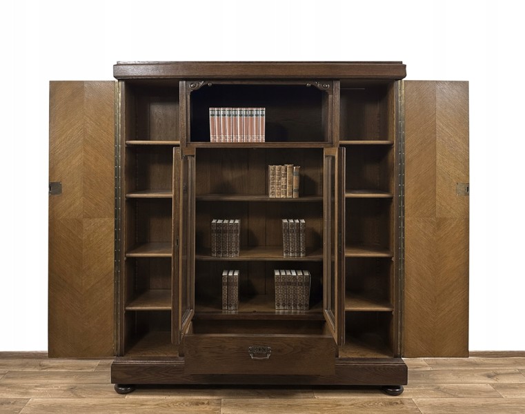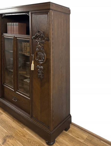 Z przyjemnością oferujemy Państwu wyjątkowej urody, antyczny mebel: rzeźbioną, secesyjną, czterodrzwiową bibliotekę z szufladą.