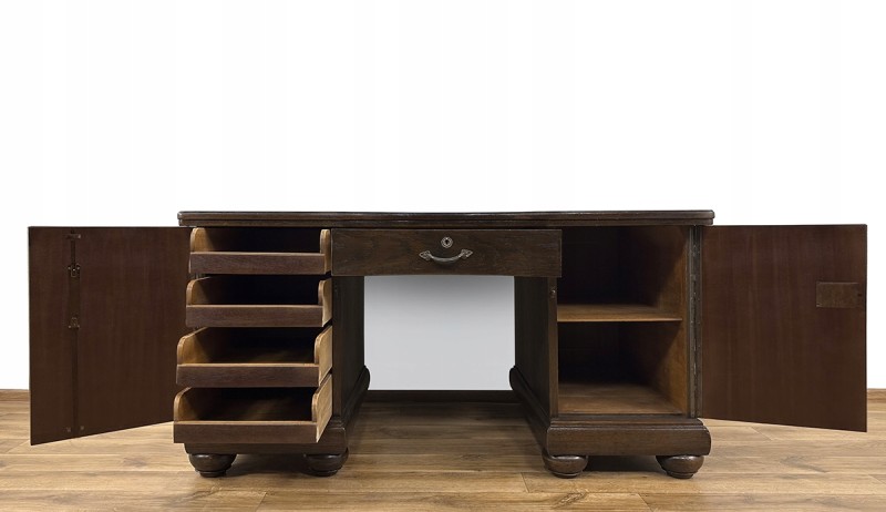 Wewnątrz za drzwiami po lewej stronie znajdują się cztery szuflady, a za skrzydłem po prawej - półka. Dodatkowym walorem biurka jest to, że jest ono dwustronne, tj. można eksponować jego tylną stronę (widać ją na przedostatnim zdjęciu).