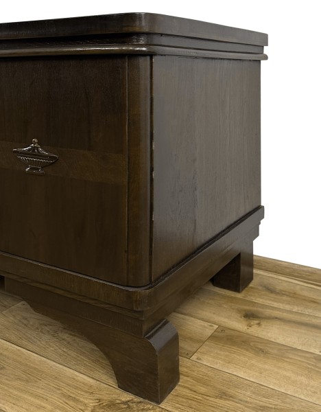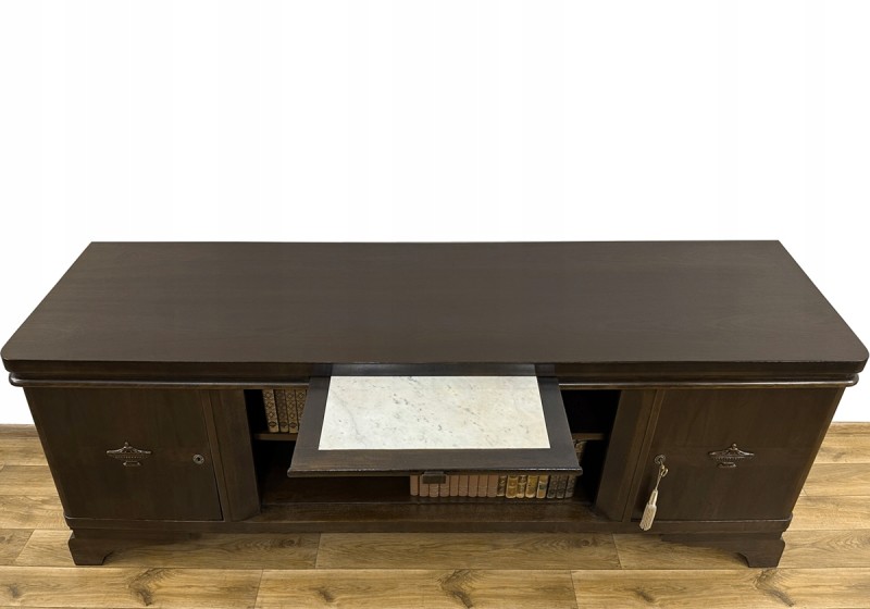 Mebel pochodzi z okresu dwudziestolecia międzywojennego - liczy około 90 - 100 lat. Wykonano go z drewna fornirowanego dębiną z elementami orzecha. Posiada po obu stronach skrzydła drzwiowe, pomiędzy którymi mieści się otwarta wnęka z półką. Za drzwiami po lewej znajdują się trzy pojemne szuflady z metalowymi uchwytami, a te z prawej kryją półkę. Każde skrzydło zdobi nieduża płaskorzeźba. Tuż pod blatem ukryty jest dodatkowy blat wysuwany (pomocniczy), wyłożony jasnym marmurem.