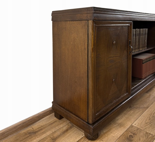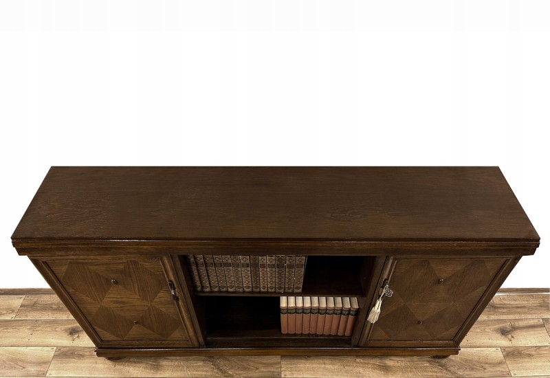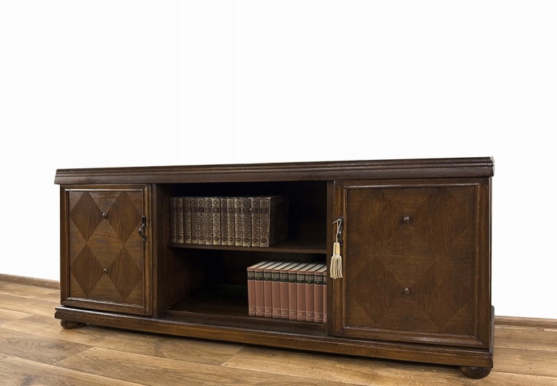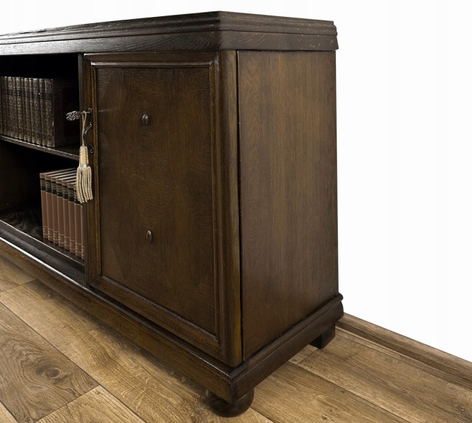 Mebel pochodzi z lat międzywojennych. Wykonany został z drewna fornirowanego dębiną. Posiada po obu stronach dwa skrzydła drzwiowe, na których fornir został dekoracyjnie ułożony w romby, z ozdobnymi "guziczkami". Każde ze skrzydeł drzwiowych, wyposażone w zamek i metalowy uchwyt, kryje wnękę z półką. Pośrodku, pomiędzy nimi, znajduje się otwarta wnęka z półką.