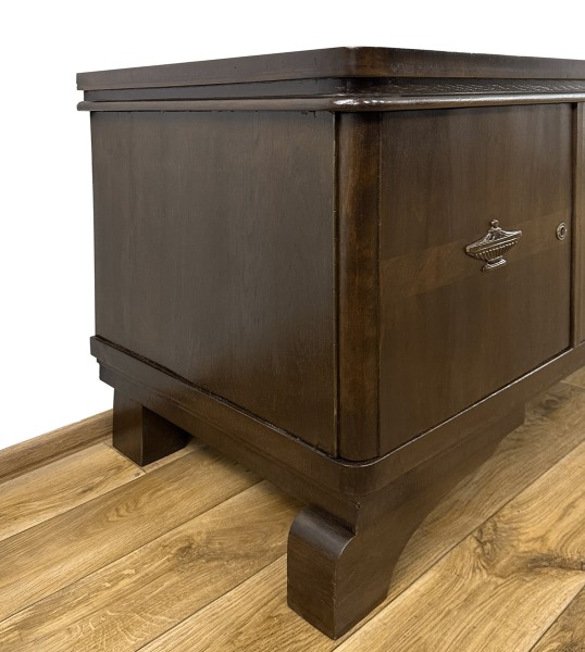 Mebel pochodzi z okresu dwudziestolecia międzywojennego - liczy około 90 - 100 lat. Wykonano go z drewna fornirowanego dębiną z elementami orzecha. Posiada po obu stronach skrzydła drzwiowe, pomiędzy którymi mieści się otwarta wnęka z półką. Za drzwiami po lewej znajdują się trzy pojemne szuflady z metalowymi uchwytami, a te z prawej kryją półkę. Każde skrzydło zdobi nieduża płaskorzeźba. Tuż pod blatem ukryty jest dodatkowy blat wysuwany (pomocniczy), wyłożony jasnym marmurem.