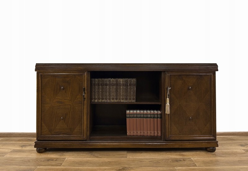 Mebel pochodzi z lat międzywojennych. Wykonany został z drewna fornirowanego dębiną. Posiada po obu stronach dwa skrzydła drzwiowe, na których fornir został dekoracyjnie ułożony w romby, z ozdobnymi "guziczkami". Każde ze skrzydeł drzwiowych, wyposażone w zamek i metalowy uchwyt, kryje wnękę z półką. Pośrodku, pomiędzy nimi, znajduje się otwarta wnęka z półką.